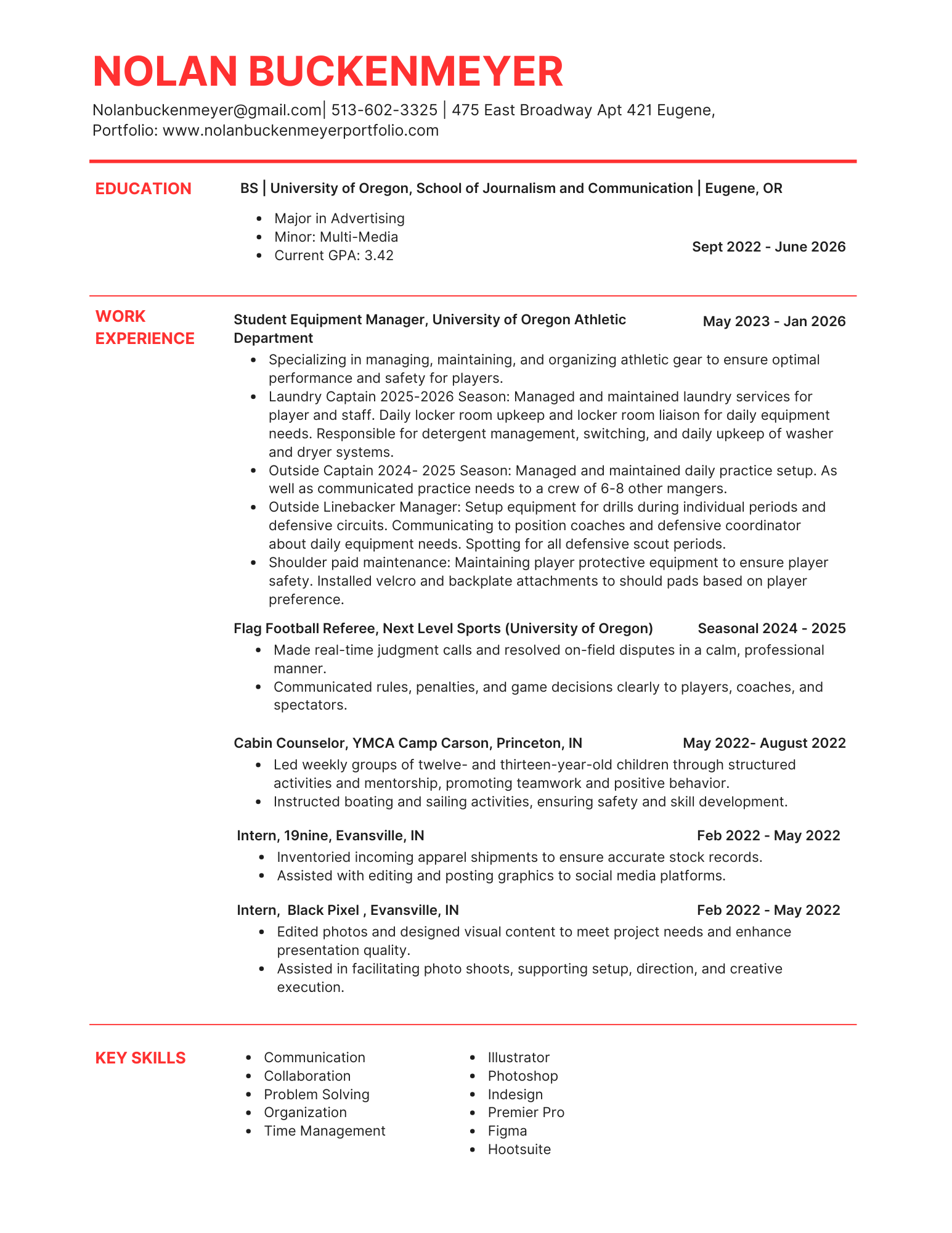 After graduation, I plan to work in advertising in a design-focused role. In college, I became knowledgeable about different Adobe Suite products, which has made me want to continue working in the design field.These roles could include open positions such as Senior Designer:Mens Footwear Studio Graphic Design, and Manager of Partnership Marketing at Barstool Sports. I currently work as an equipment manager for the football team at the University of Oregon. Being an equipment manager has taught me the behind-the-scenes of how a college football program runs, and I plan to continue working in sports after college.